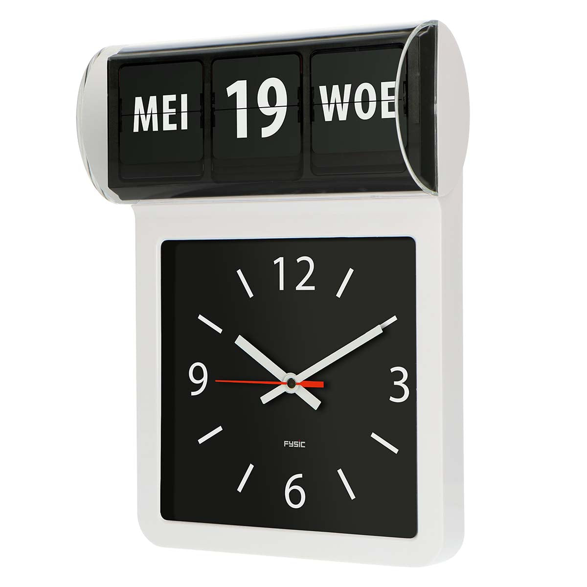 große analoge Wanduhr, die sowohl die Uhrzeit, den Wochentag als auch das Datum
