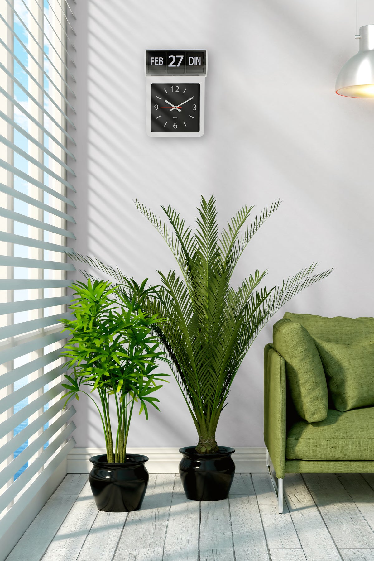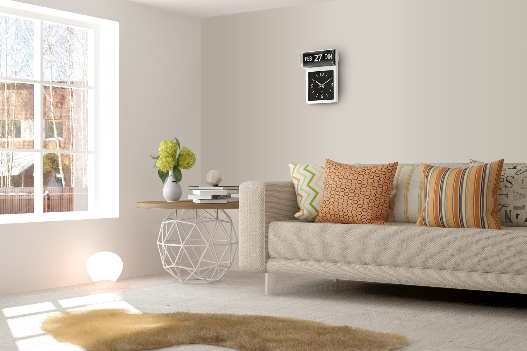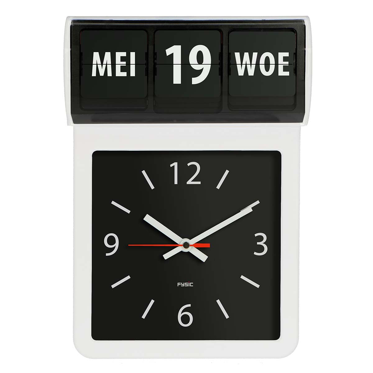 große analoge Wanduhr, die sowohl die Uhrzeit, den Wochentag als auch das Datum